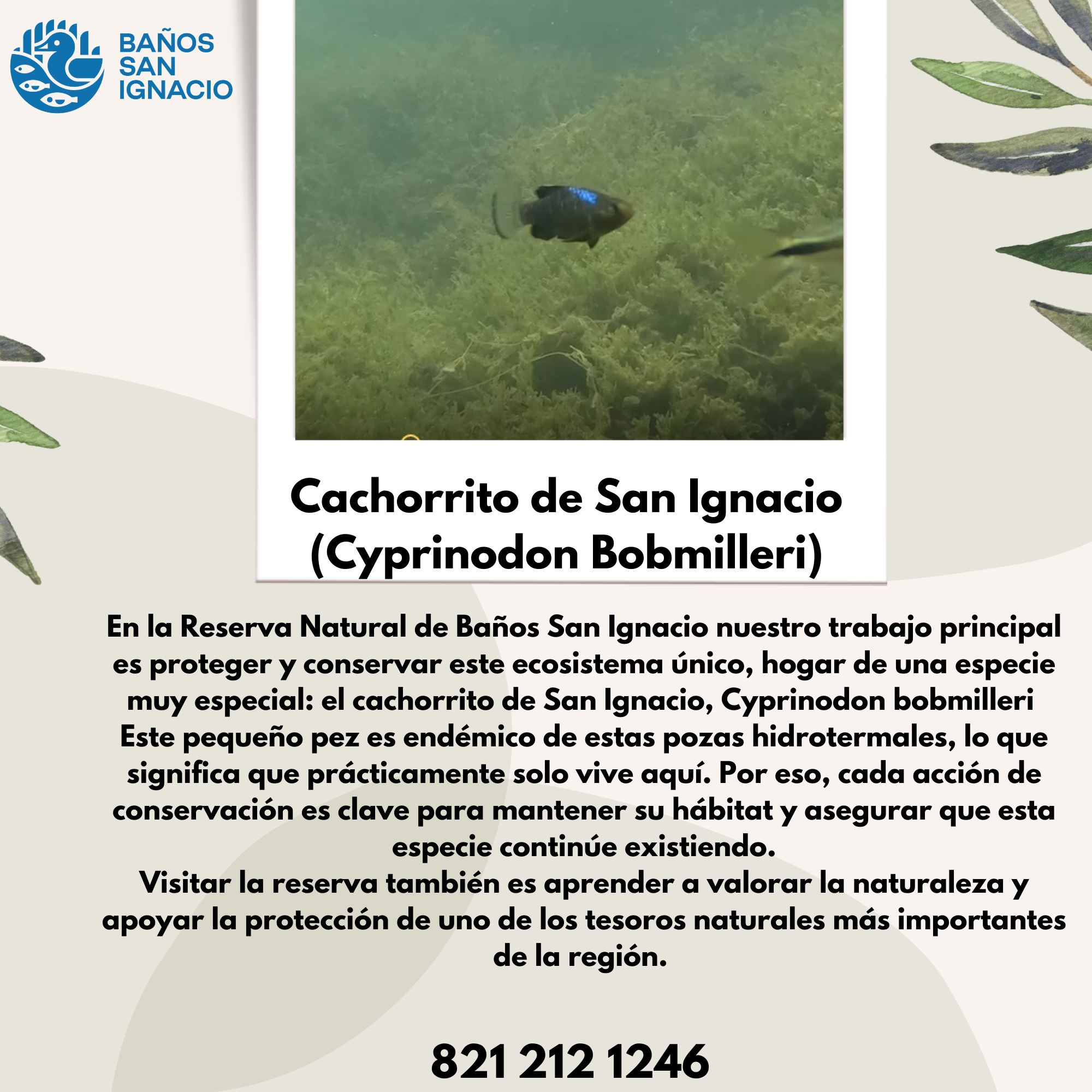 Este pequeño pez es endémico de estas pozas hidrotermales, lo que significa que prácticamente solo vive aquí. Por eso, cada acción de conservación es clave para mantener su hábitat y asegurar que esta especie continúe existiendo.